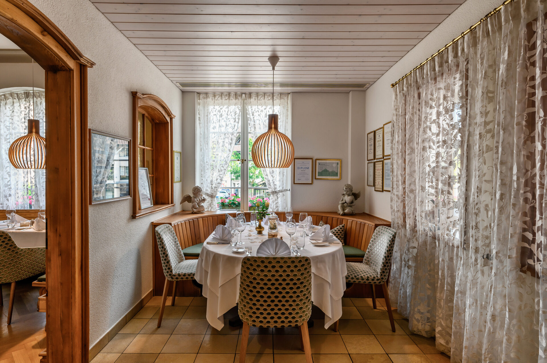 Im Parterre befindet sich unsere elegante Moosseestube. Nebst einem eleganten Mittag- oder Abendessen à la Cartet bietet sie sich auch an für Bankette bis 25 Personen.